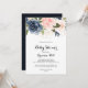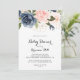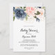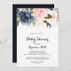 Este elegante convite para chás de fraldas de caligrafia floral de inverno é perfeito para um chá de fraldas moderno. O design apresenta belas flores azuis escuras, azuis, marinhos, rosa, pinceladas, douradas e folhagem verde pintadas manualmente, amontoadas em buquês elegantes.