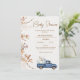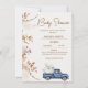 O Chá de fraldas moderno Brown Beige Pumpkin Truck Convite Elegante para outono O convite para o chá de fraldas inclui um arranjo floral e foliar no lado e um caminhão cheio de abóbora azul no fundo. Este design é ideal para o chá de fraldas de um menino do outono.