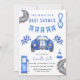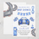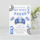 Cartão de convite para chá de fraldas do tema Race car com ilustrações de aquarela de um carro azul e pista de corrida, posto de gasolina, bandeira de corrida. "Corrida para um chá de fraldas."