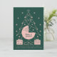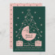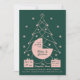 Carruagem de bebê rosa e verde ilustrada em frente à árvore de natal. Ilustrações originais de Becky Nimoy.