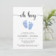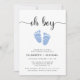 Um simples convite para chá de bebê casal com "oh boy" em um roteiro de na moda com pestanas e uma cor de água azul pastel de pés de bebês. Por baixo, você pode personalizar facilmente os detalhes do chá.