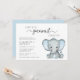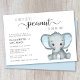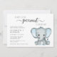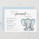 Um bebê bonitinho casal um convite de chá com "Um Doce Pequeno Amendoim Está A Caminho" em tipografia de cinza macia e um roteiro de haste na moda e uma aquarela azul pastel de um elefante bebê. Adicione os nomes da mãe e do pai e os detalhes do chá em uma simples tipografia de cinzas moderna.