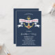 Este convite para chás de fraldas náuticos apresenta uma âncora falsa de ouro brilhante, uma faixa de safra azul e branca, um coração vermelho agudo e um fundo azul marinho.