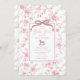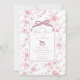 Elevem a celebração do chá de fraldas com o nosso belo convite para a apresentação de fotografias florais, cor-de-rosa e branco, que inclui um encantador padrão toile de jouy. Esta peça elegante mostra um arco de coquete e um belo cavalo de balanço. Perfeitamente concebido para dar um tom sofisticado ao seu evento, este convite não só transmite a sua alegre ocasião, como também adiciona um toque de elegância eterno que os seus convidados adorarão. Torne seu chá de fraldas inesquecível com este convite incrível que reflete estilo e graça.