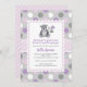 Este convite para chás de menina fofa tem um doce ursinho segurando balões com bolinhas fundo em roxo e cinzas.