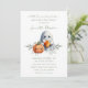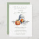 Este convite para chás de fraldas apresenta um tema de bebê do Dia das Bruxas fofo. Um pequeno fantasma do estilo crochê é fotografado no centro segurando um pedaço de milho doce e ao lado de uma abóbora crochetada. Um buquê da respiração do bebê é colocado abaixo dos pequenos entupimentos. A frase, "um pequeno bu está quase vencido" é impressa no topo em uma letra elegante. As informações do evento são impressas em uma fonte verde de sábio, adequada para um garoto, uma garota ou um chá de fraldas neutro em relação ao gênero.