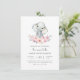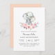Um adorável design chá de fraldas com um elefante enquadrado por um buquê floral. Os detalhes do seu chá personalizado aparecem abaixo em tipografia moderna e fofa. Essas cartas se invertem a uma cor rosa pastel com um charmoso padrão branco.