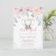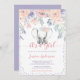 Este belo convite para chá de fraldas de elefante pastel é tão querido! Lindas flores de aquarela, cor-de-rosa e roxo-lavanda.