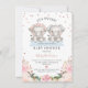 Chá de fraldas de Elefantes Gêmeos Florais Azuis, Cor-de-Rosa, Brilhante, Convite para o chá de fraldas do elefante doce para gêmeos e rapazes com dois elefantes agudos, um arranjo floral com folhas falsas de ouro rosa, pontos de ouro rosa e uma faixa azul.