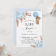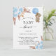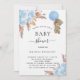 Para um chá de fraldas moderno estilo boho. Fundo branco. Decorado com flores azuis-claras, rosas, grama-pampas e um ursinho-peluche segurando um balão azul. Personalize e adicione um nome e detalhes da parte.