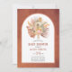 Folhas de palma secas tropicais, erva-palmeira-palmeira e flores de protea, convite para chá de fraldas de arco. Este design bonito apresenta um quadro de arco sobre fundo manchado de terracota. No quadro há um buquê de aquarela de palmeiras secas, flores de proteína e capim de pampas.