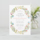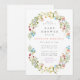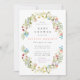 Um convite bonito para o chá de fraldas perfeito para o primavera com um quadro oval circundante de flores silvestres de cor aquática em folhas azuis, corais e amarelas vibrantes e verdes.