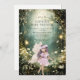 Uma fada mágica temida convite encantado de chá de fraldas florestal, com um cenário de floresta encantado na floresta com luzes suspensas brilhantes, e uma fada sobre um caminho arborizado. Disponível no impressão, como um download digital para enviar em seu telefone ou em ambos.