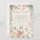 Um Chá de fraldas De Rapariga Cony Script Bonito Convide. Este design de estilo vintage tem um belo coelho a saltar por trás das flores e folhagem. Você pode personalizar facilmente todo o texto de acordo com suas necessidades. Um fundo de creme coordenado está atrás.