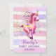 O convite para Chás de fraldas de menina doce apresenta um unicórnio de cor-de-água bonito, em tons roxos e cor-de-rosa, com borrão de poeira de fada de ouro impressa e fundo de listras de cor-de-água púrpura e rosa. Todo o texto na frente e no verso deste convite está pronto para ser personalizado.