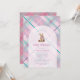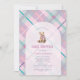 Celebrar a chegada com este adorável convite de chá de fraldas com um doce ursinho vestindo um arco cor-de-rosa, enquadrado dentro de um gracioso design de arco. O fundo destaca uma xadrez de rosa claro acentuada com lavanda e verde-marinho, criando uma paleta fresca e alegre. No verso, uma versão mais escura da xadrez adiciona profundidade e contraste para um acabamento polido. Uma escolha perfeita para um chá de menina, esta design combina o charme clássico com uma cor moderna e divertida.