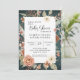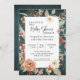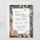 Um fundo rico e profundo de textura aquosa de turquesa com lindos pessegueiros de cor aquosa neutra e flores de terracota com menta, sábio e folhagem verde-musgo. "BoHO Turquoise Fall Autumn Floral Chá de fraldas Invitation." Pintada e gráfica desenhada por uma artista e designer internacionalmente licenciada, Audrey Jeanne Roberts. Direitos autorais.
