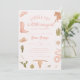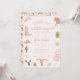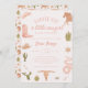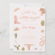 Cartão de convite para chá de fraldas para raparigas bonitinhas, com ilustrações de botas de vaqueiro, cavalo, cobra, crânio, cacto, chapéus de vaqueiro, etc. O texto diz "sela! uma cowgirl está a caminho"