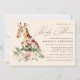 Convite para chás de fraldas tropicais que inclui uma mãe aquosa e girafa bebê com flores de marfim e de hibisco cor-de-rosa com folhas verdes e folhagem em fundo creme. "Chá de fraldas" é exibido em um script de caligrafia moderno com os detalhes do chá de fraldas mostrados abaixo. O chá de fraldas de girafa convida para trás para um fundo castanho sólido com espaço para texto e/ou imagens.