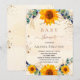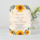 Um fundo de cor aquosa de ouro decorado com girassóis, eucalipto verde, folhas de ouro e pó de ouro falso. Personalize e adicione um nome e detalhes da parte.