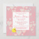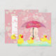 Um tema de chá de uma menina bebezinha de borracha de brinquedo vintage apresenta um lindo, de olhos azuis, bebê com um guarda-chuva vermelho alegre. A menina se senta entre um bando de patos de borracha amarelos em um borrão de corações pastéis e chuva suave. Disponível em um tema cor-de-rosa ou azul ou neutro junto com uma adorável coleção de decorações de chás de fraldas, jogos de chá de fraldas e favores de chá de fraldas para uma celebração original de boas-vindas.