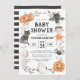 Convide convidados para o seu chá de fraldas temático do Dia das Bruxas com estes adoráveis convites para chuveiros de bebês! O chá de fraldas de Halloween convida a exibição de "Chá de fraldas" em tipografia escrita à mão com os detalhes do seu chá abaixo. A borda apresenta pinturas de jack-o-lanternas, morcegos, monstro de Frankenstein, aranha, fantasma, múmia e um gato preto complementado pela folhagem da cinza. A parte de trás do convite apresenta faixas de aquarela pintadas a preto e branco.