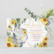Este adorável convite será perfeito para um chá de fraldas de verão. O design apresenta girassóis de cor d'água elegantes, verde-jardim e um lindo e adormecido elefante para bebês.