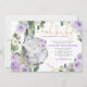 Este adorável convite para chás de fraldas apresenta elegantes rosas violeta e lavanda, verde-luxuoso e um lindo elefante para bebês.