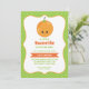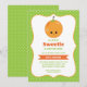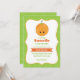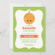 Convite para chás de fraldas bonitos e na moda com uma adorável fruta laranja sorridente kawaii, o texto "Um pequeno docinho está a caminho!" numa combinação correspondente de serifas casuais e modernas de sans, e espaços reservados para texto para os detalhes do seu partido em uma brilhante carta verde. Esta design doce é enquadrada por um suporte com um contorno laranja brilhante sobre um padrão de fundo de bolinhas verdes e brancas brilhantes. Personalize facilmente este design para corresponder ao seu estilo clicando em "Personalizar" para ir para a ferramenta design e adicionar o seu próprio texto ou detalhes personalizados.