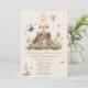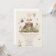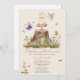 Tema do chá de fraldas de fadas com ilustração do toco florestal rodeado por cogumelos, borboletas, insetos, fadas e flores silvestres. Stump é tocado com bolo tocado com sinal de "É uma garota".