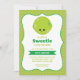 Convite para chás de fraldas bonitos e na moda com um adorável limão sorridente kawaii, o texto "Um pequeno docinho está a caminho!" em uma combinação correspondente de tipos de sans serif casuais e modernos, e espaços reservados de texto para os detalhes do seu partido, combinando uma inscrição verde brilhante. Este doce design é enquadrado por um suporte com um contorno verde brilhante sobre um padrão de fundo de bolinhas brancas e verdes brilhantes. Personalize facilmente este design para corresponder ao seu estilo clicando em "Personalizar" para ir para a ferramenta design e adicionando o seu próprio texto ou detalhes personalizados.