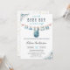 Celebre a chegada de um doce bebê com este charmoso convite de chá de fraldas. Apresentando adoráveis roupas de bebê de aquarela penduradas em uma linha de roupas com florais azuis macios, este design é brincalhão e elegante. Perfeito para honrar os pais a serem, este convite personalizável inclui espaço para detalhes do evento, informações de RSVP e notas de registro de presentes. Uma bela escolha para uma celebração clássica e animadora de chás de fraldas.