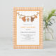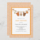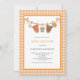 Este convite para o chá de fraldas, tema do outono, apresenta uma fronteira laranja de gingham e uma adorável linha de roupa com roupas de bebê, bíblia e abóbora festiva de outono, fantasma e doce. Voltar ao convite tem o gingham laranja. Perfeito para o Halloween ou chá de fraldas de outono. Personalize o texto com informações de nome, data, local e rsvp. Excelente de homenagear uma futura mãe durante a estação assustadora.