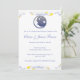Simples convite de chá de fraldas com lua circular azul e branca e emblema de estrelas, bordas de nuvens e estrelas amarelas, e texto azul. Lua, Estrelas e Nuvens Obrigado Lua de Placa Plana, Estrelas e Nuvens Obrigado Vazio de Cartão-Postal