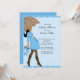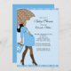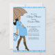 Comece seu doce chá de fraldas de bebê com nossa moderna mãe africana para segurar um guarda-chuva de bolinhas castanho e azul sobre um fundo de bolinhas azul. Visite nosso compro para uma grande seleção de convites para um chá de fraldas de bebê.