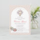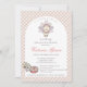 Convite para Chá de fraldas de Ação de Graças e Queda para uma menina. Possui uma linda garotinha peru e torta em um adorável fundo de gingham. A parte de trás é impressa com um padrão de penas gingham espalhadas.