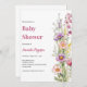 Um fundo branco chic. Decorado com flores silvestres em rosa, roxo, amarelo. Personalize e adicione o nome da mãe a ser e os detalhes da festa.