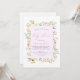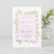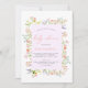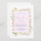Um convite de chá de fraldas floral colorido que apresenta um quadro de flores silvestres de cor d'água em volta de uma caixa retangular lilás. "chá de fraldas" está na fonte do estilo caligráfico moderno dos corais