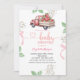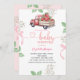 Um convite de chá de fraldas bonito apresenta morangos aquosos no caminhão, arco rosa e folhas. Esses convites para chuveiros de bebês são facilmente personalizados para seu evento simplesmente adicionando seus detalhes.
