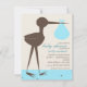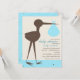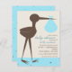 Um convite para o chá de fraldas na moda moderno com ilustração de um carregando de cegonha, um pacote de impressão de ovo azul e salgado. Correspondência de baixo e ilustração ao contrário. Personalize o texto azul e marrom na frente e atrás. Procure itens correspondentes na Paperie de Jill