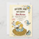 Este adorável convite para chás de fraldas de desenho mostra um pintinho bebê eclodindo de um ovo colorido em um ninho, cercado por flores de primavera e um pássaro azul alegre.