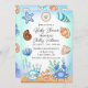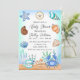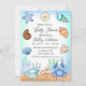 Caranguejo desenhado à mão, conchas, estrelas, peixe-estrela, e convites para chuveiros de bebês de garotinho e coral azul com um tema de praia.