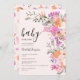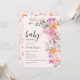 Bebê em Bloom! Flores silvestres românticas pastéis chás de fraldas de verão com bonito flores selvagens em cor-de-rosa, pêssego, roxo, lavanda, folhas verdes e muito mais, com uma tipografia com script escovado sobre um elegante e editável fundo rosa pastel macio.