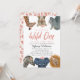 Cartão modelo de convite para chá de fraldas do tema Cute Safari com ilustração desenhada à mão de uma girafa, leopardo, rinoceronte, leão, elefante e zebra. O texto diz "um pouco selvagem está a caminho". Os animais estão vestindo chapéus, coroas e flores cor-de-rosa.