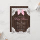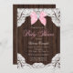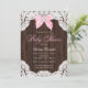Lace branco, arco cor-de-rosa e pérolas com chá de fraldas rosa e cor-de-rosa sobre fundo da madeira e castanho. Este suave convite para chás de fraldas rústicos cor-de-rosa e castanho é facilmente personalizado para o seu evento, adicionando os seus detalhes no estilo de letra e cor, bem como o texto da sua escolha.