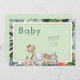 Bonita Girafa, chita, elefante e rinoceronte. Convite para Chá de fraldas de Folhagem de Watercolor. De volta branca. Cores neutrais. Animais da Savana.