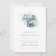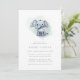 Elegante convite para chás de fraldas de aquarelas que apresentam um lindo elefante bebê sentado. O outro lado do cartão possui um padrão de vinha floral de cinza desenhada manualmente.