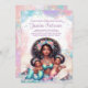 Duas sereias gêmeas convidadas para um banho de bebês com uma bela sereia africana segurando duas doces sereias em uma bonito bolha pastel e um fundo de conchas. Este convite para chá de fraldas de sereia dupla é facilmente personalizado para o seu evento simplesmente adicionando os seus detalhes. Você também pode adicionar uma cor de fundo à frente e atrás.