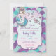 Um convite de chá de fraldas de sereia, com uma bela sereia e adorável sob as criaturas do mar contra o fundo do oceano profundo do arco-íris. Personalize-o com os detalhes do seu partido de forma fácil e rápida, basta pressionar o botão personalizá-lo para reorganizar e formatar o estilo e o posicionamento do texto. Itens correspondentes disponíveis no repositório! (c) O feliz Cat Studio.