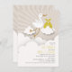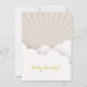 Um convite de chá de fraldas com uma ilustração de uma cegonha com um feixe amarelo, nuvens e rajadas de sol. Personalize o texto.